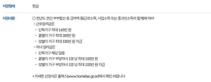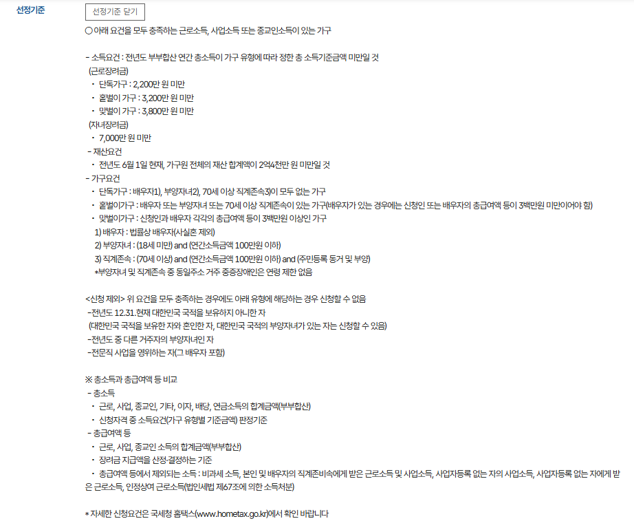 - 소득: 가구 소득 기준에 따라 다르지만, 기본적으로 근로 소득이 있는 자여야 합니다. 소득 기준은 매년 변동될 수 있으므로 최신 정보를 확인해야 합니다.