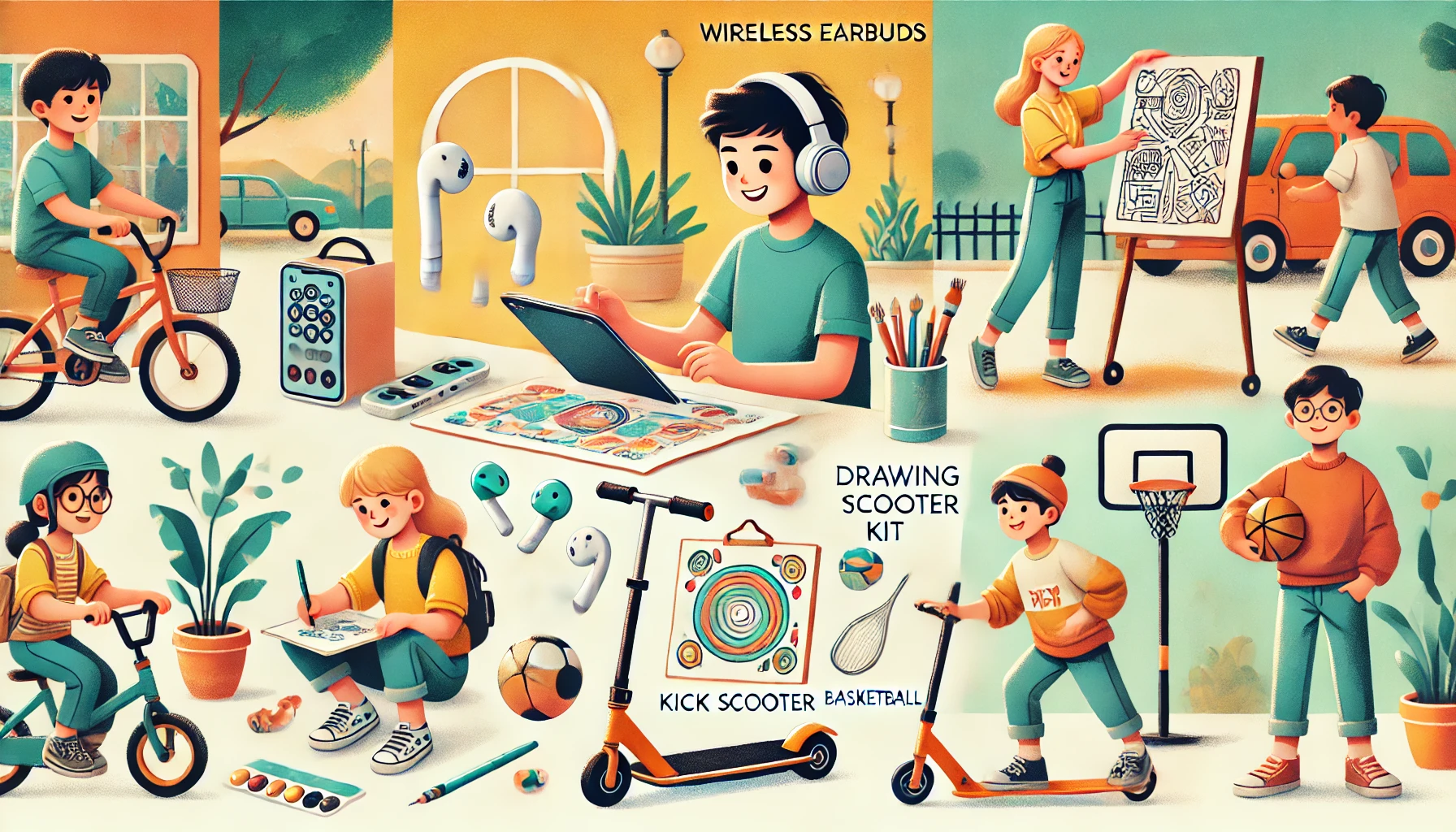 추천: 무선 이어폰, 드로잉 키트, 킥보드, 농구공
